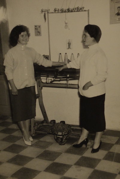 Caterina Eichmann-Ferrantino, Arbeiterin von 1960–1997 an diversen Orten, u.a. Feldmühle in Rorschach, Stickerei Jakob Senn in Arbon und sia in Frauenfeld, erzählt, wie wichtig ihr als gelernte Coiffeuse und Schneiderin ein schönes Aussehen ist. In die Schweiz kommt sie nur mit einem Paar Stöckelschuhe. Die Bilder aus Italien zeigen Caterina Eichmann-Ferrantino (2.v.l.) am Tag, als sie ihr Diplom als Schneiderin bekam sowie in selbstgenähter Kleidung. Ihre beiden älteren Schwestern, später ebenfalls in den Thurgau ausgewandert, stehen vor der heimischen Stickmaschine – frisiert von Caterina Eichmann-Ferrantino.