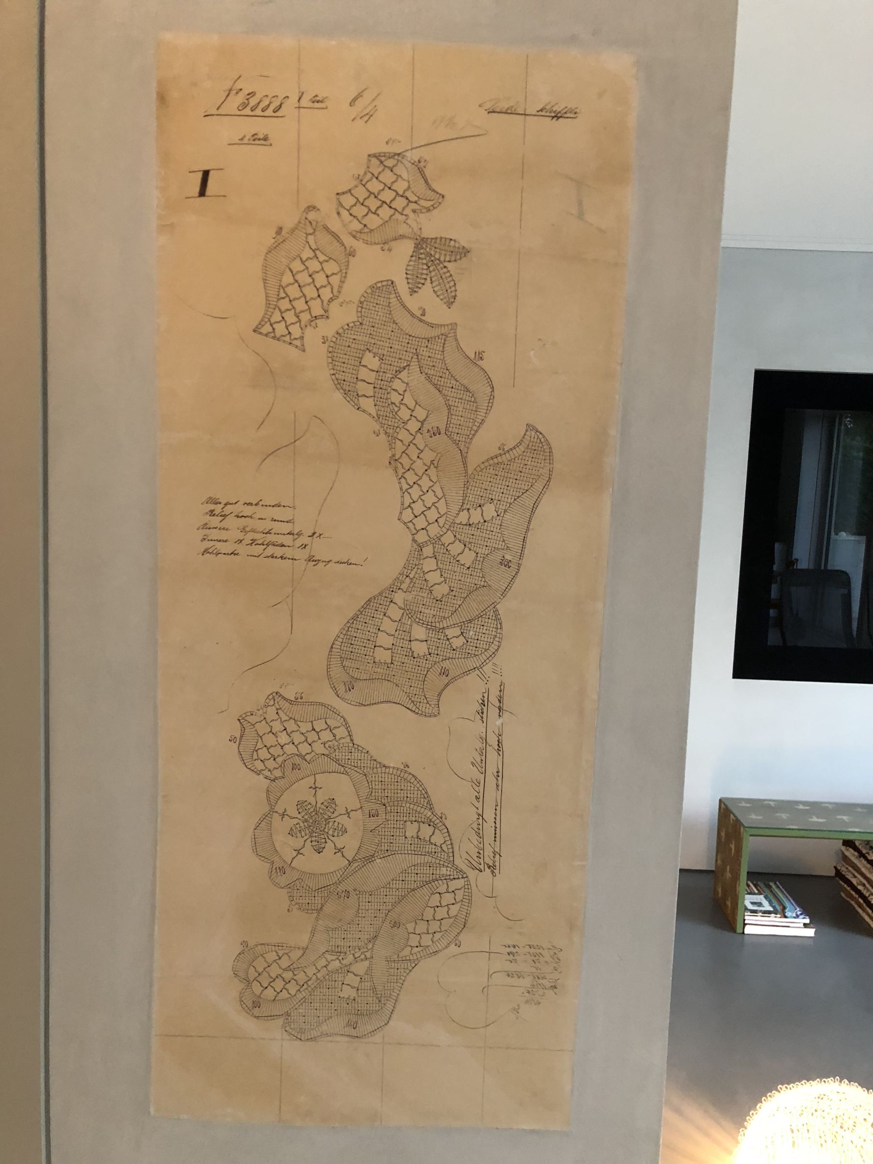 Bei Renovationsarbeiten in einem Wohnhaus in Amriswil entdeckte die Hausbesitzerin diese Stickereivorlage der Firma Stucki. Sie stammt wohl aus der Zeit um 1900. Nun ziert sie als Wandschmuck das renovierte Untergeschoss. So wurde die Vorlage zu einem persönlichen Erinnerungsstück, welches von einem wichtigen Kapitel der Textilindustrie erzählt.