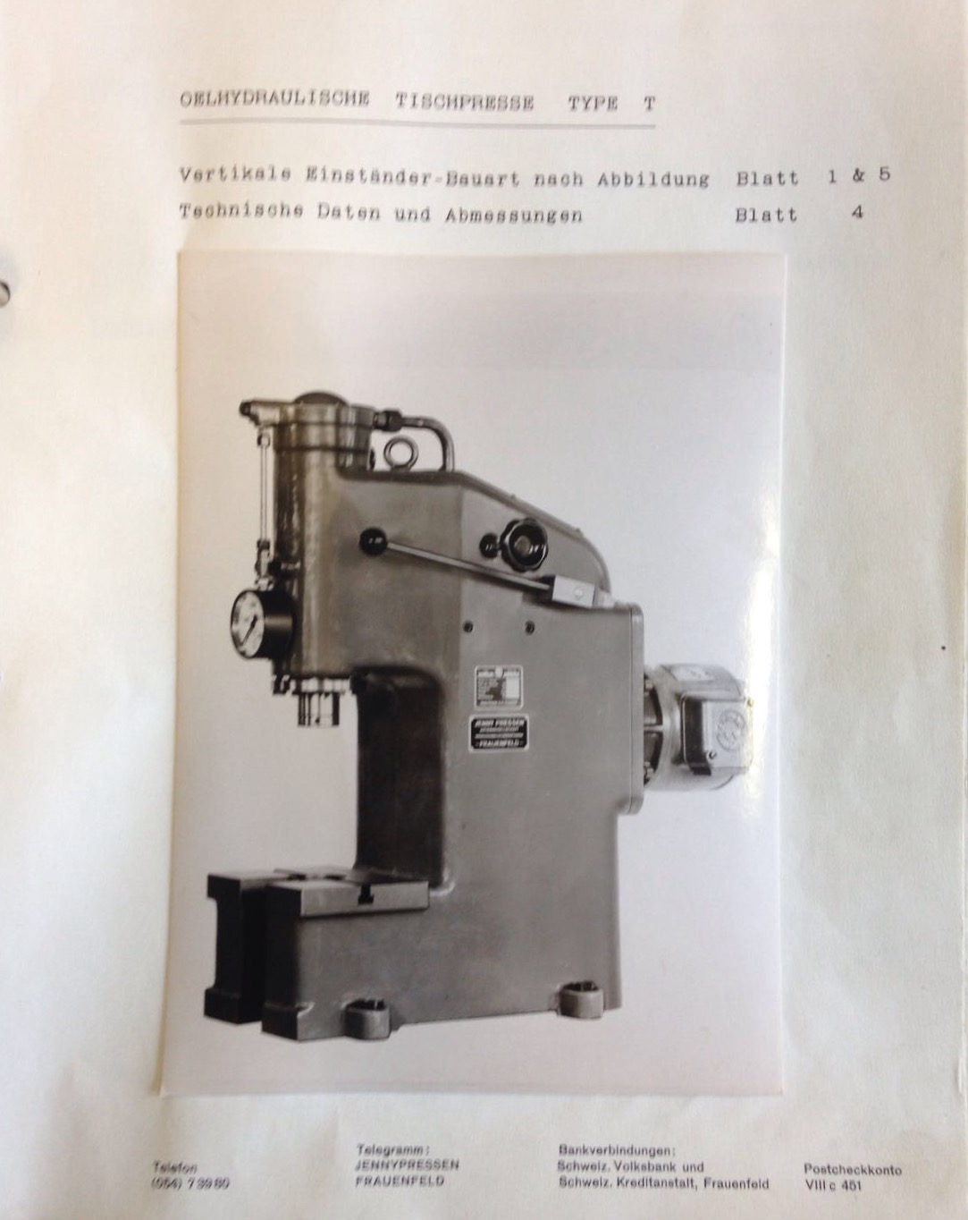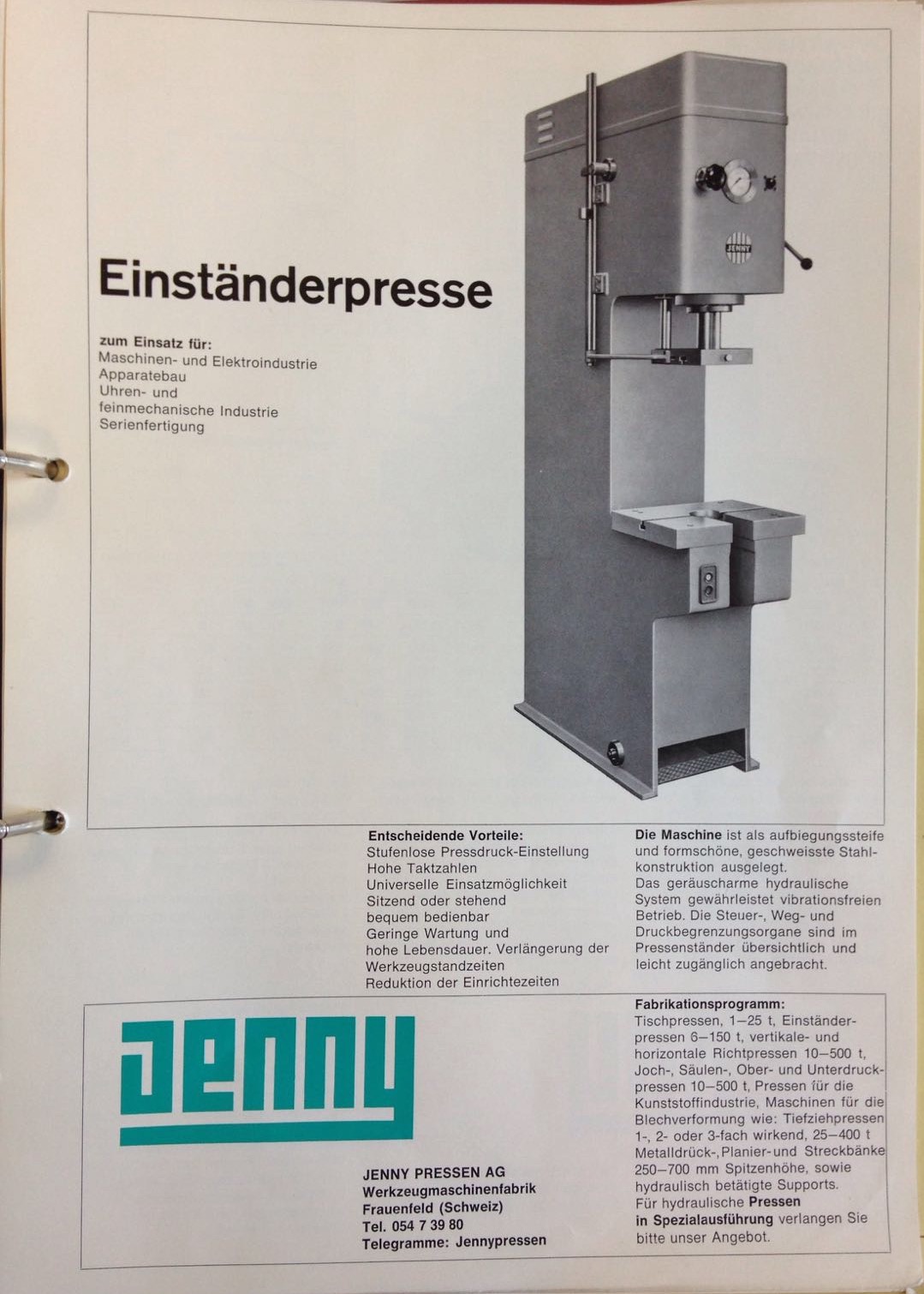 Diese Broschüren gehören zu einem Arsenal von Richtpressen, welche heute nicht mehr im Einsatz sind. Richtpressen dienen der Begradigung von Metallteilen, die später in grössere Maschinen eingebaut werden. Die abgebildeten Richtpressen wurden von der Frauenfelder Firma Jenny produziert und vor etwa 30 Jahren bei der Firma Galdabini in Felben-Wellhausen eingesetzt. Die meisten der abgebildeten Pressen funktionieren mit Ölhydraulik und können eine Kraft von bis zu 500 Tonnen aufbringen. Die Pressen selbst wurden in den 2010er-Jahren entsorgt und stehen somit heute nicht mehr bei der Firma Galdabini, lediglich die Broschüren sind erhalten. Die Firma Galdabini entwickelt und verkauft heute noch in Felben-Wellhausen grössere Maschinen.