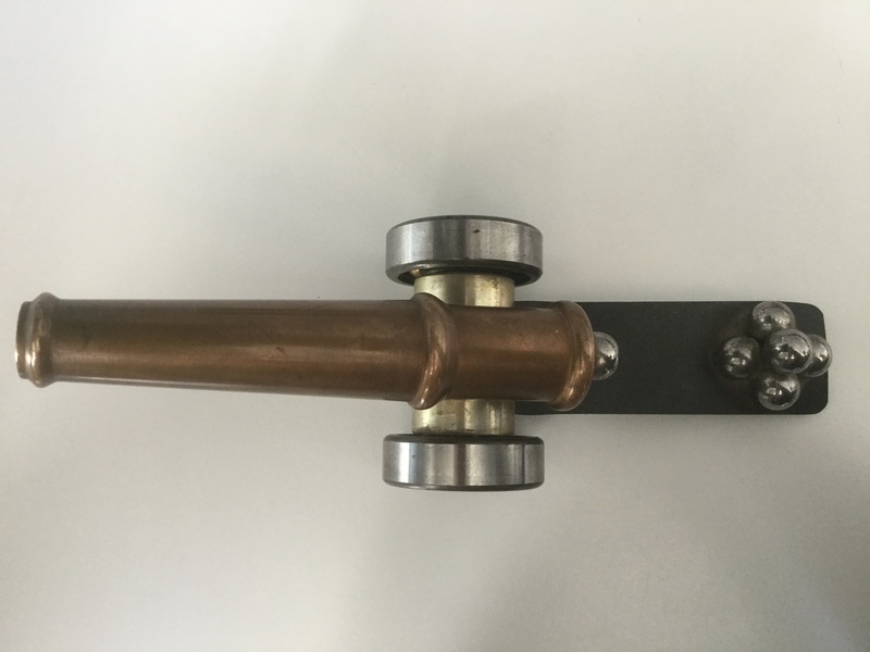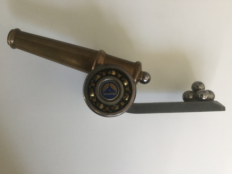 Dies ist eine Miniatur einer Kanone auf Laufgestell. Die Räder sind kugelgelagert, darauf ist das Saurer-Logo zu sehen. Die Kanone wurde in den 1970er-Jahren von einem Lehrling der Firma Saurer während seiner Ausbildung zum Polymechaniker hergestellt. Als der Vorgesetzte des Lehrlings die Firma verliess, erhielt er von ihm diese Kanone als Abschiedsgeschenk. Saurer war damals eines der grössten Schweizer Unternehmen und vorab in der Lastwagenproduktion tätig. Wenig später brach das Lastwagengeschäft von Saurer ein. Die Firma Saurer stellt heute noch Stickmaschinen her.