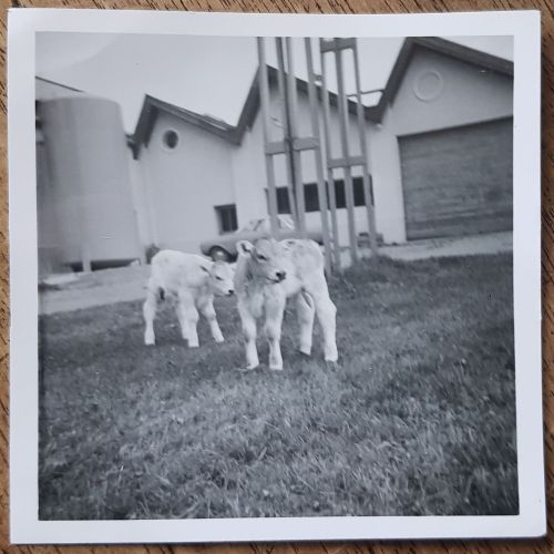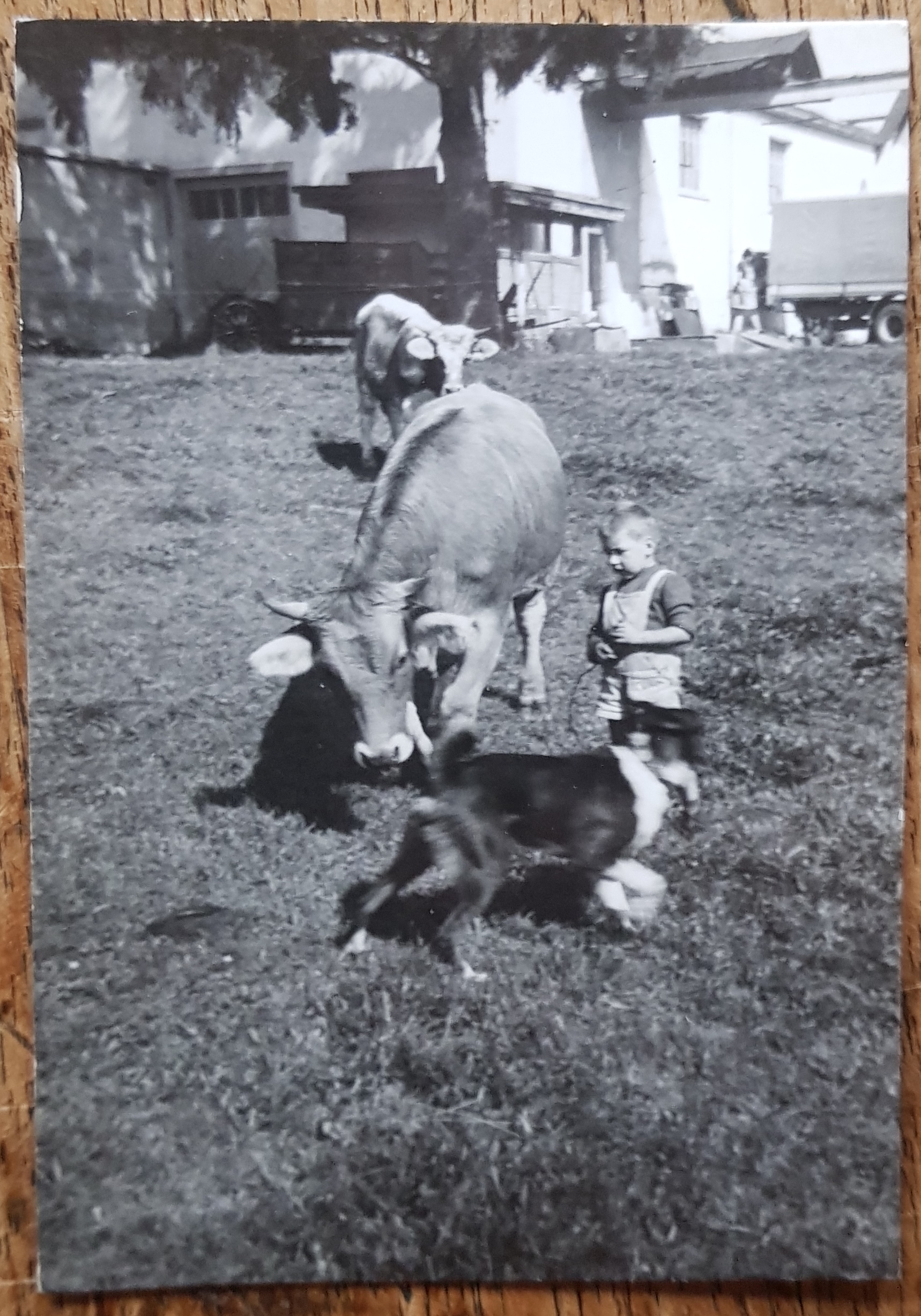 August Jud, Chauffeur von 1956–1973 für die Färberei Brunnschweiler in Hauptwil, berichtet, wie ihn die Landwirtschaft nicht losliess. Einmal kehrte er von einer Fahrt mit zwei Schafen zurück – der Start zu einer eigenen Schafherde, später kamen noch Kühe dazu. Dass er jedoch häufig abwesend war, machte ihm zu schaffen. Auf den Fotos Kälbli vor der Färberei Brunnschweiler sowie der jüngste Sohn mit Kühen und Lastwagen im Hintergrund.