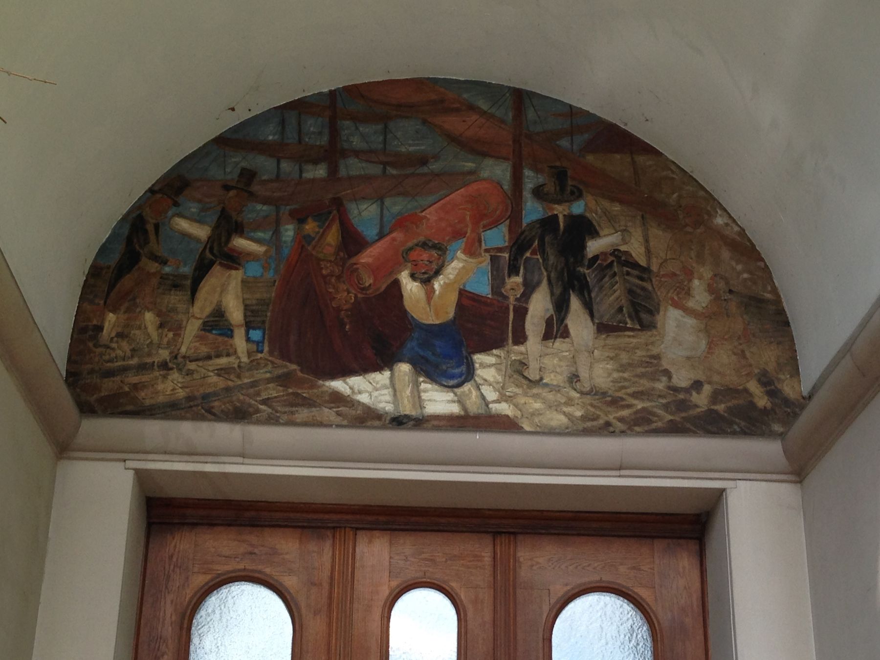 Dieses Bild befindet sich über der Eingangstüre zum Fabrikantenhaus eines ehemaligen Textilbetriebs in Sulgen. Es zeigt eine Handels-Szene am Hafen. Das Gebäude liegt unmittelbar neben dem Bahnhof in Sulgen.