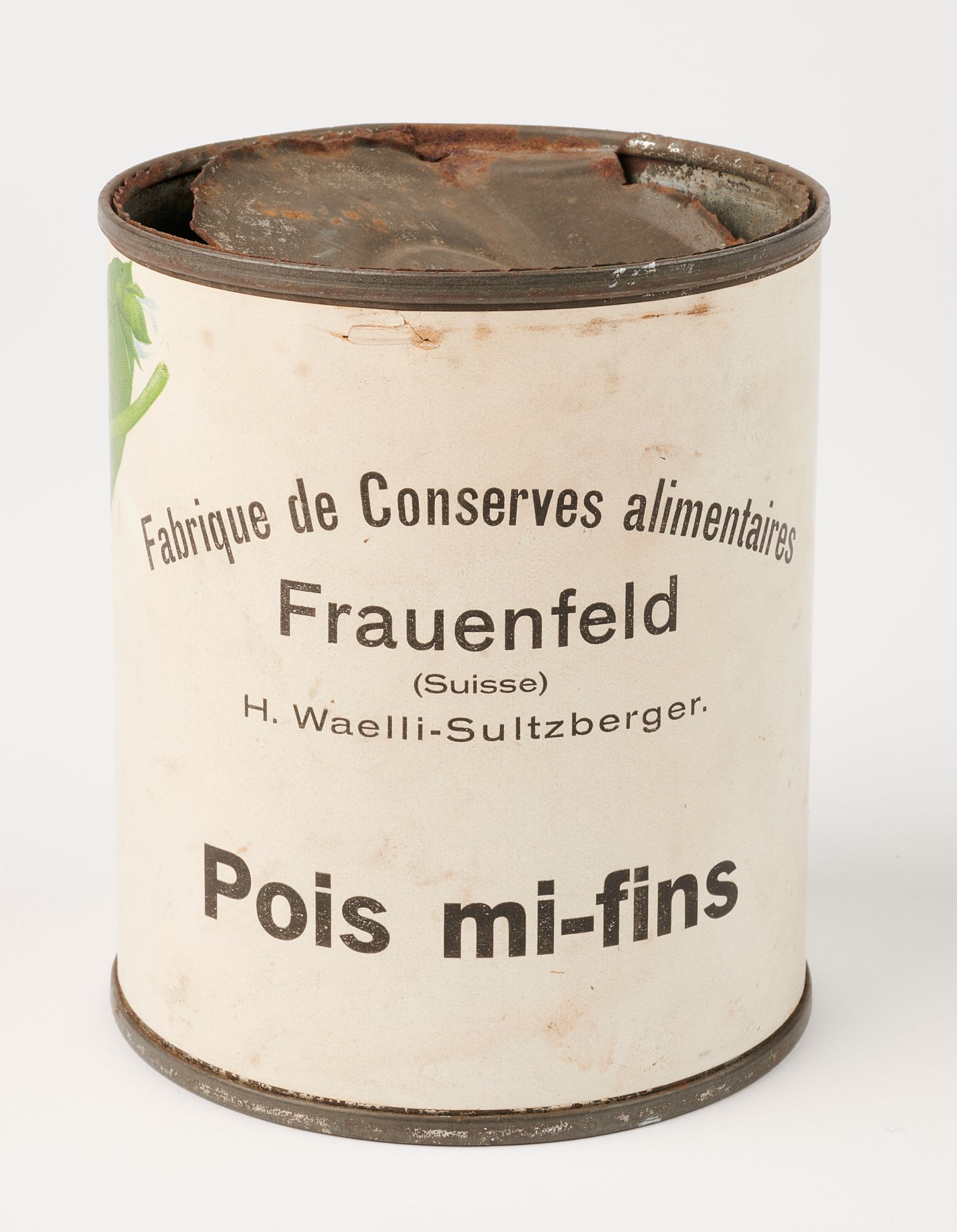 Diese Büchse aus der Sammlung des Historischen Museums Thurgau enthielt grüne Erbsen. Sie wurde von der 1902 gegründeten Firma «Fabrique de Conserves alimentaires Frauenfeld (Suisse)» hergestellt. 1906 fusionierte sie mit der Konservenfabrik Lenzburg.