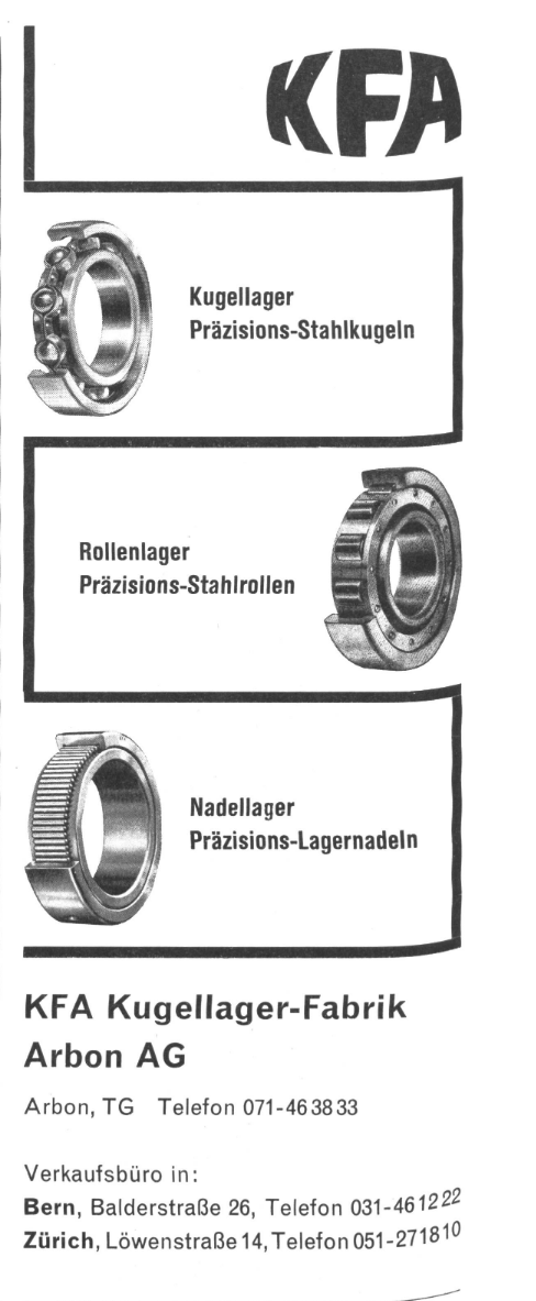 Margrit Bietenholz absolvierte von 1946–1949 eine kaufmännische Lehre bei der Kugellagerfabrik in Arbon. Sie erklärt, wie die verschiedenen Kugellager funktionieren – sie füllten gar einen ganzen Katalog. Die Bilder zeigen Werbeinserate der KFA aus den 1930er- und 1960er-Jahren (ETH-Bibliothek).