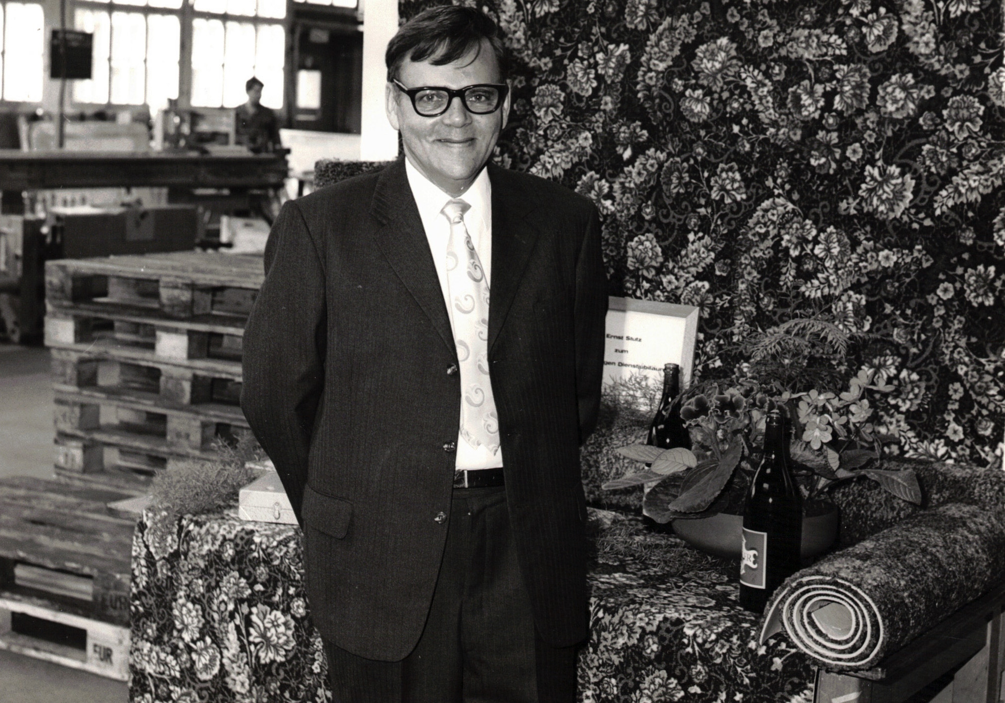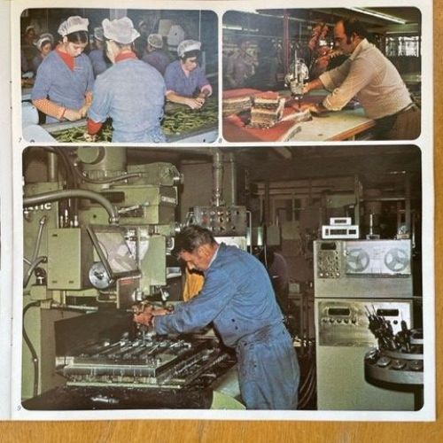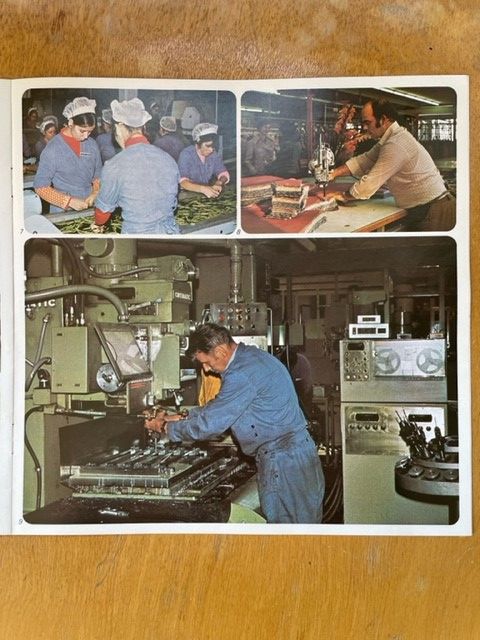 Unten die Abbildung eines Testbuchs, wohl aus den 1960er-Jahren. Solche Halbfabrikate dienten bei Martini dazu, die Buchbindereimaschinen in ihrer Funktion und Produktion zu testen. Die Gaze wurde beim Heftvorgang der Fadenheftmaschine mitangenäht und diente der Stabilität des Buches. Weitere Bilder: Der Onkel bei seiner Tätigkeit als Anreisser sowie bei seinem 25-jährigen Arbeitsjubiläum bei Martini, 1977. Familienangehörige beim Betrachten einer Fadenheftmaschine, Besuchstag in der Martini, 1950er-Jahren.
