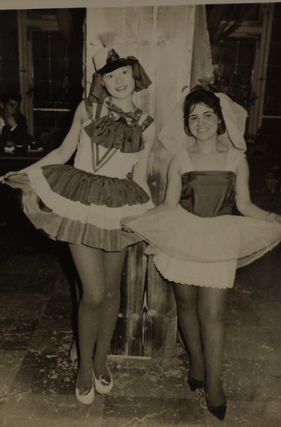 Caterina Eichmann-Ferrantino, Arbeiterin von 1960–1997 an diversen Orten, u.a. Feldmühle in Rorschach, Stickerei Jakob Senn in Arbon und sia in Frauenfeld, erklärt, weshalb sie als gelernte Schneiderin von der Fabrik in Rorschach in die Stickerei Jakob Senn nach Arbon wechselte: Der Grund waren 10 Rappen mehr Lohn pro Stunde. Das Foto zeigt die 20-Jährige Caterina Eichmann-Ferrantino (rechts) in einem selbstgenähten Fastnachtskostüm in einem Arboner Restaurant.